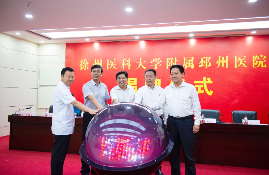 夏有兵书记、郑葵阳校长、陈静书记、吴宪主任和王进院长共同为徐州医科大学附属邳州医院揭牌。揭牌仪式后,参会领导一行共同参观了邳州市人民医院新院区。