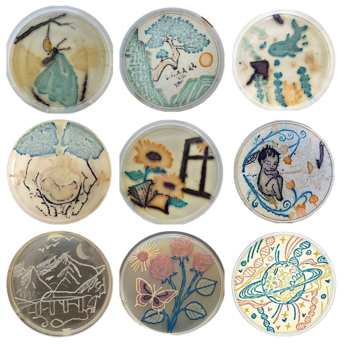 培养皿艺术被誉为“微观世界的生命艺术”,是科学精神与美学素养深度融合的创新载体。参赛学子以无菌操作技术为实践根基,以细菌、酵母等微生物为创作原料,在琼脂培养基上精心设计布局,通过精准调控菌株培养条件,让不同微生物在生长过程中呈现出缤纷色彩与独特形态,最终勾勒出一幅幅兼具科学内涵与艺术审美的生命画卷。这一创作过程,既是对微生物学专业知识的实践运用,更是对“科学之美”的生动诠释。此次获奖是我校高度重视美育与专业教育的深度融合,将“课程美育”纳入人才培养体系,让美育种子在专业教学土壤中生根结果,实现了知识、能力与价值的有机统一。