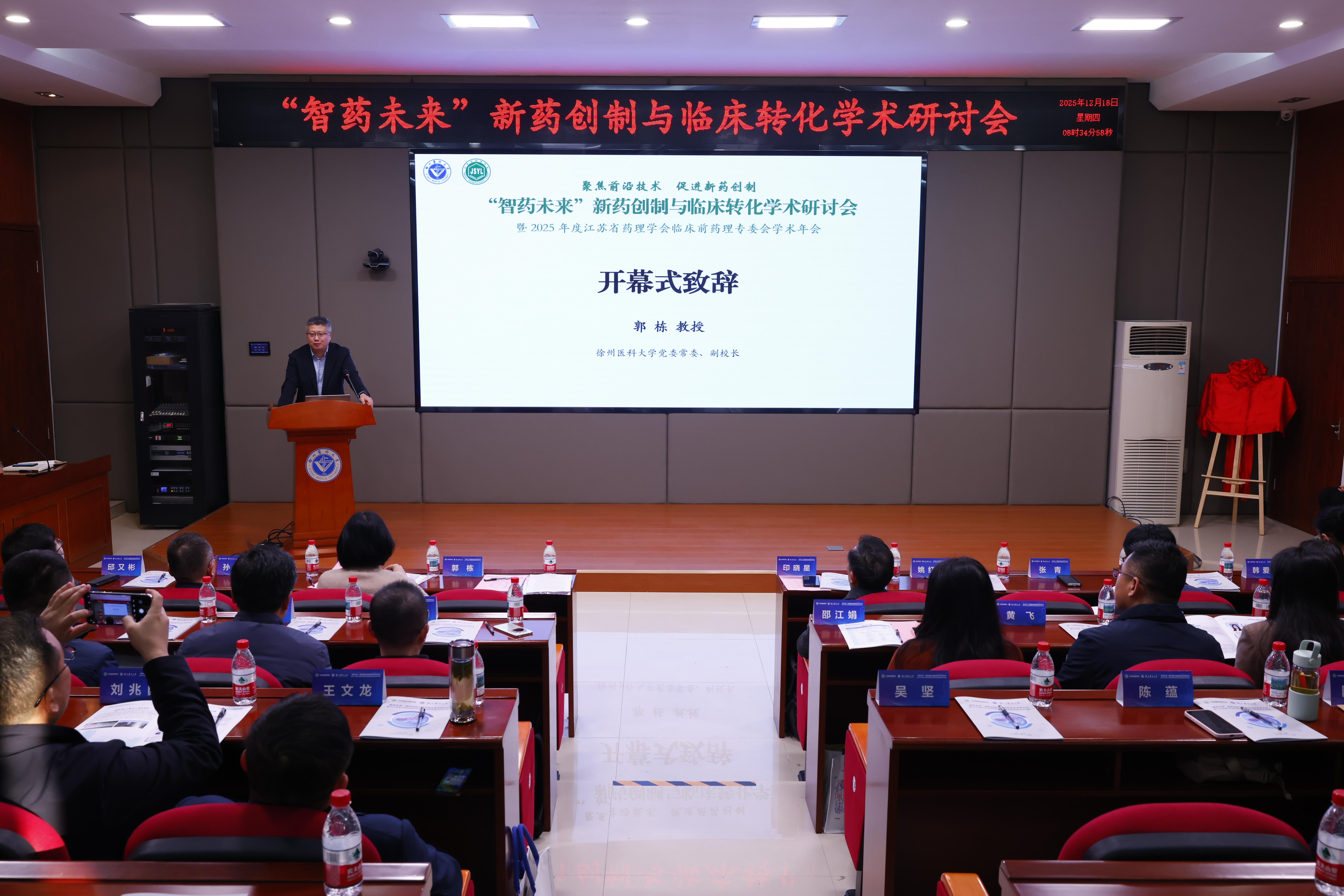 12月18日,“智药未来”新药创制与临床转化学术研讨会暨2025年度江苏省药理学会临床前药理专委会学术年会在我校举办。本次会议由江苏省药理学会、徐州医科大学主办,徐州医科大学药学院、江苏省药理学会临床前药理专委会承办,江苏恩华药业股份有限公司、华越健康产业集团协办。会议围绕“聚焦前沿技术、促进新药创制”主题,倡导以国家重大需求和国际科学前沿为导向,致力于将前沿技术应用于新药创制,促进科研成果转化,解决重大医学难题,提高人们的生活质量和健康水平。会议开幕式由江苏省药理学会临床前药理专委会主任委员、徐州医科大学药学院院长周雪妍主持。