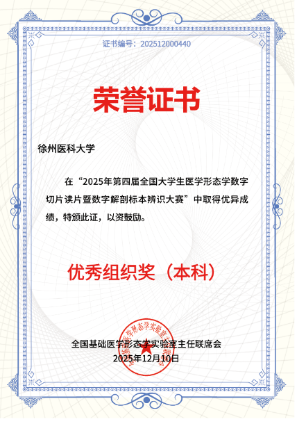 为进一步推动数字技术与医学教育深度融合,强化学生实践能力与临床思维培养,全国基础医学形态学实验室主任联席会于12月7日举办了“第四届高等医学院校大学生数字形态学读片和数字解剖标本辨识技能大赛”线上总决赛,并于12月20日举办了该大赛的线下总决赛。该大赛作为全国医学形态学领域的重要赛事,吸引了全国220余所院校的1.7万余名学生参与竞技,赛事规模创历届新高。经过激烈比拼,我校共计34人次获奖,其中特等奖2项、一等奖4项、二等奖11项、三等奖19项,连续四届荣获“优秀组织奖”。