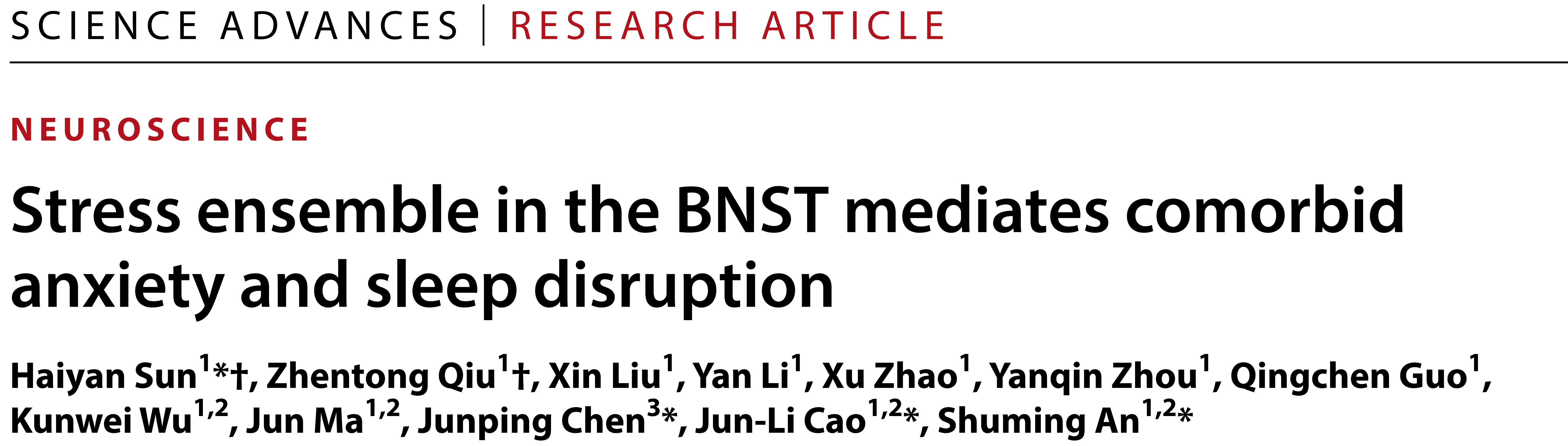 2月4日江苏省麻醉学重点实验室/江苏省麻醉与脑科学重点实验室安述明、曹君利教授与宁波市第二医院麻醉科陈骏萍主任团队合作在Science Advances(综合期刊1区,Top 期刊,自然指数期刊)杂志上发表文章揭示终纹床核应激神经元集群介导焦虑与失眠共病-“Stress ensemble in the BNST mediates comorbid anxiety and sleep disruption”。该研究由麻醉学重点实验室孙海艳副教授和硕士毕业生邱桢童为共同第一作者,麻醉学重点实验室安述明、曹君利教授、孙海艳副教授与宁波市第二医院麻醉科陈骏萍主任为共同通讯作者。