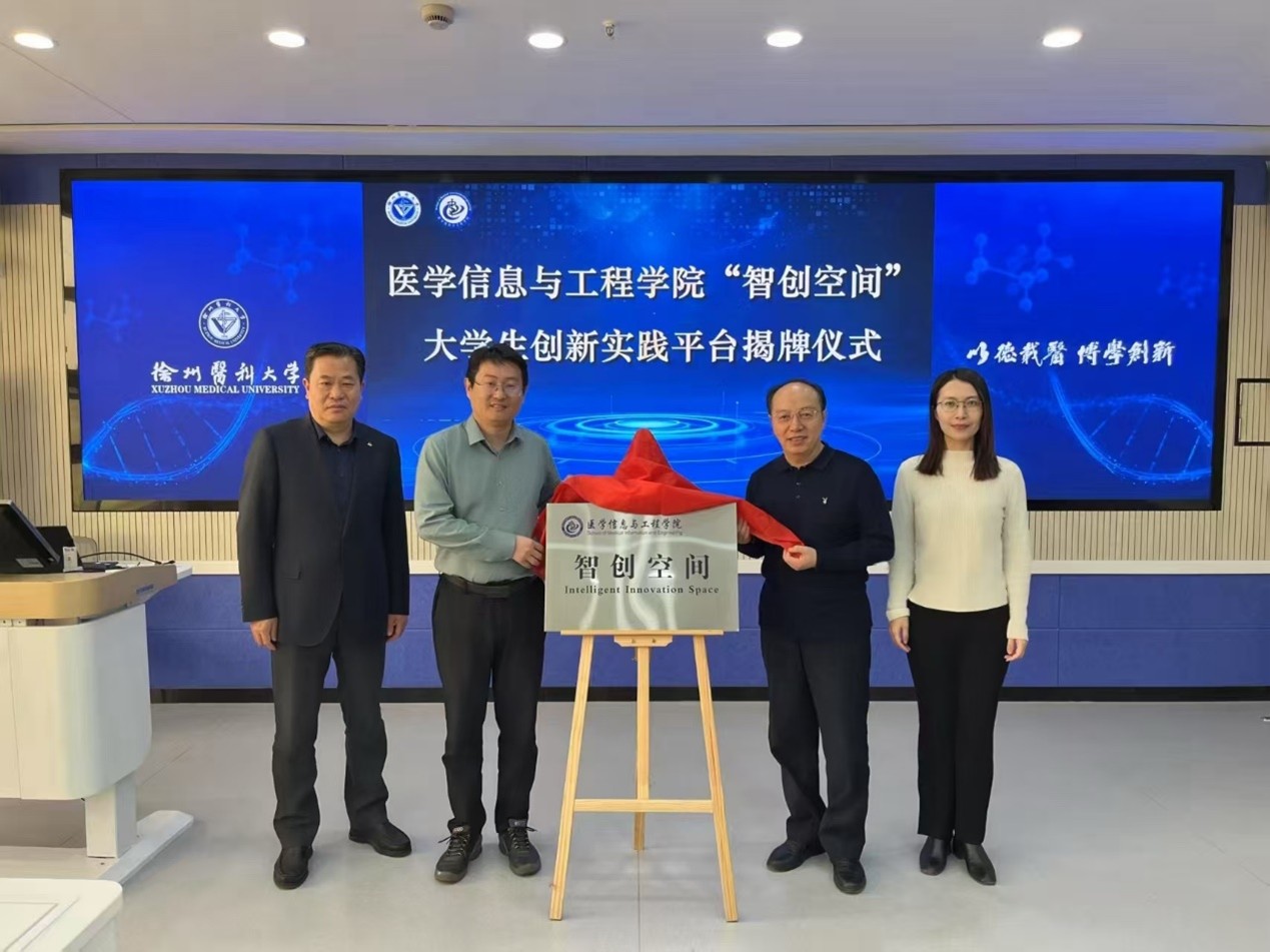 副院长吴响和党总支副书记张姝分别从人工智能的发展历程和大学生科创报国、创新劳动教育模式等方面鼓励学生砥砺深耕,勇于创新,创造精彩。随后,大家共同为医学信息与工程学院 “智创空间”大学生创新实践平台揭牌。