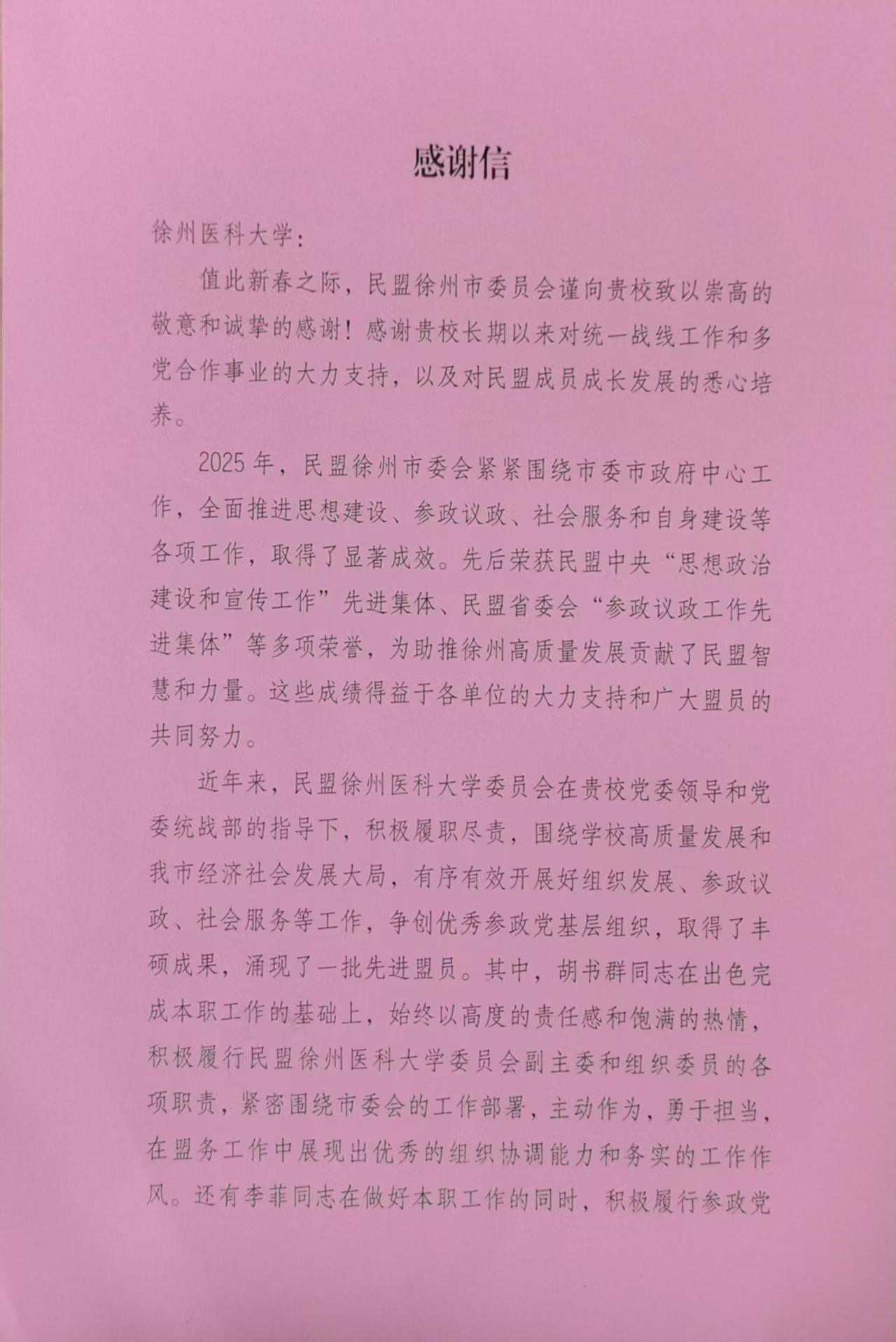 近日,我校收到民盟徐州市委员会发来的感谢信,对我校长期以来支持统一战线工作、助力多党合作事业发展,以及悉心培养民盟成员表示衷心感谢,并对我校民盟基层组织及优秀盟员的突出表现给予高度评价。
