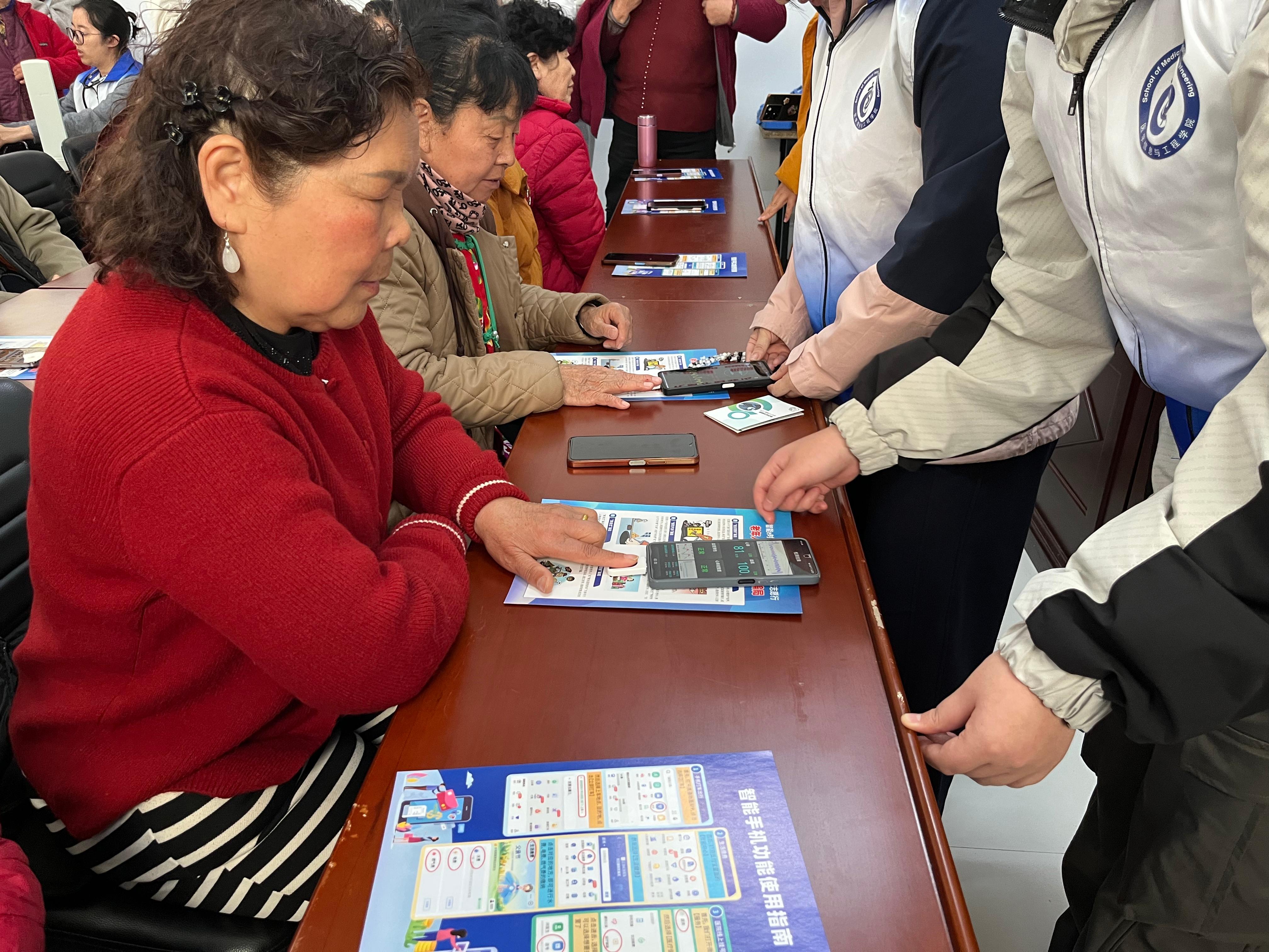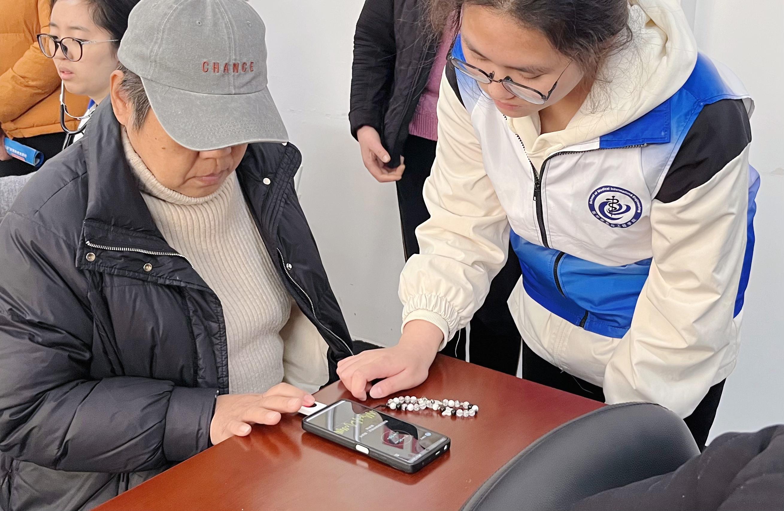 志愿者使用学院教师与学生团队共同研发的便携式心血管健康检测设备,为老人进行心率、血氧饱和度等关键指标检测。该设备基于指尖光电容积脉搏波技术,可实现无创快速检测,且支持与手机互联,仅需20秒,老人的心率、血氧饱和度、动脉硬化度、脉搏节律等健康数据便可实时显示在手机屏幕上。志愿者们根据检测结果为老人逐一解读数据,并结合检测结果给出个性化的心血管健康指导,让老年人在家门口享受专业的健康监测服务。老人们纷纷点赞:“这个设备太方便了,不用去医院排队,短短20秒就能了解自己的心血管健康状况!”