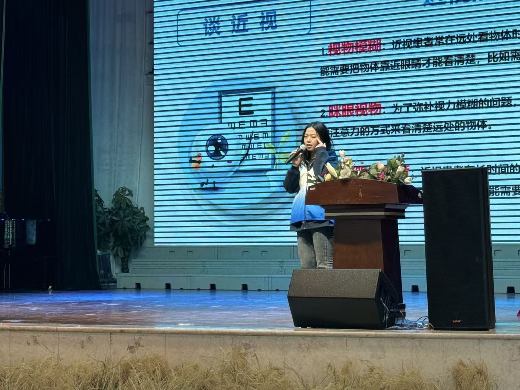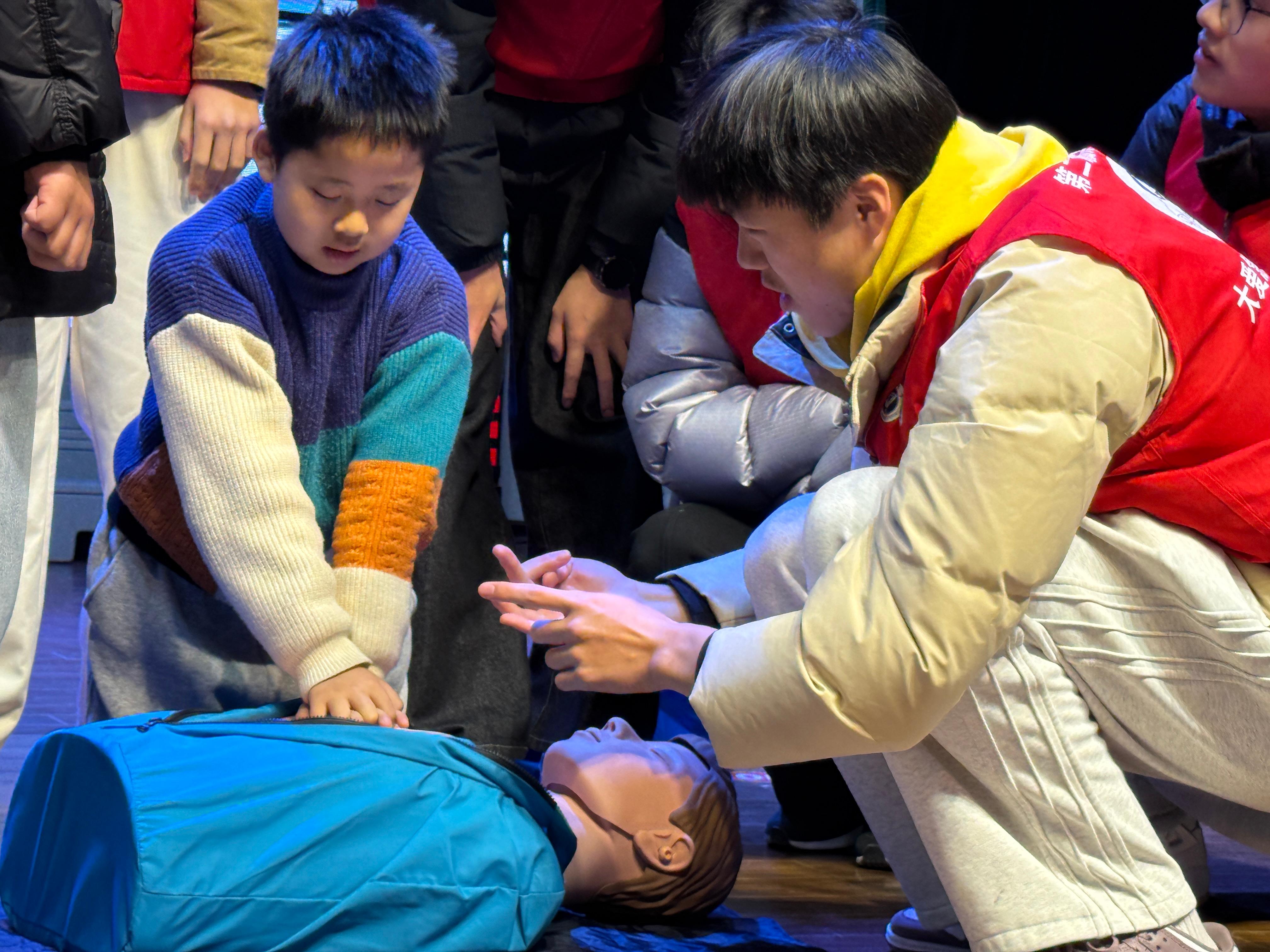 主题宣讲结束后,志愿者们结合专业所学,为孩子们带来健康科普课堂。志愿者徐欣然讲解眼睛构造与近视防控,帮助孩子们树立爱眼护眼意识。志愿者鲍昱锟现场演示心肺复苏和海姆立克急救法,并邀请孩子们实操体验。在志愿者指导下,孩子们认真学习急救要领,掌握实用技能。志愿者们还发放了自制的健康知识小卡片,将专业与趣味相结合,让孩子们在互动中收获知识,让奉献的种子在心中生根发芽。
